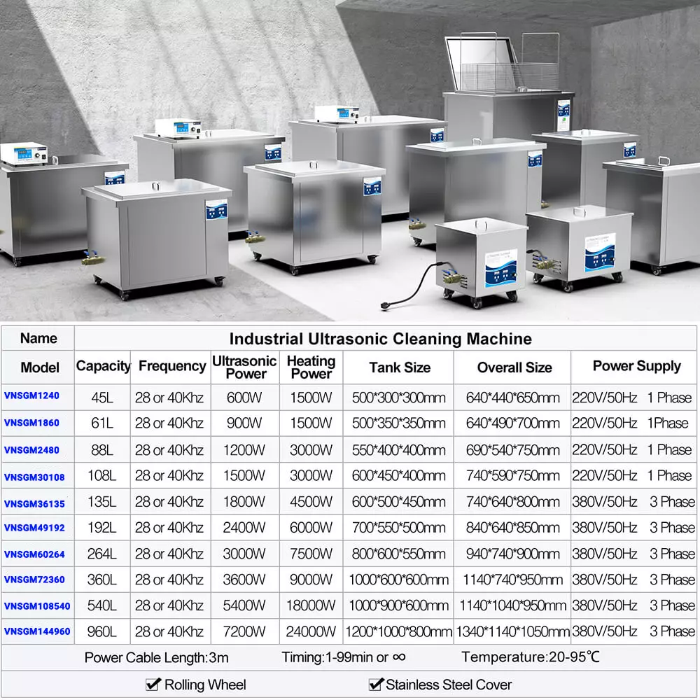 | VNSGM144960 | 960L | 28 or 40Khz | 7200W | 24000W | 1200*1000*800mm | 1340*1140*1050mm |