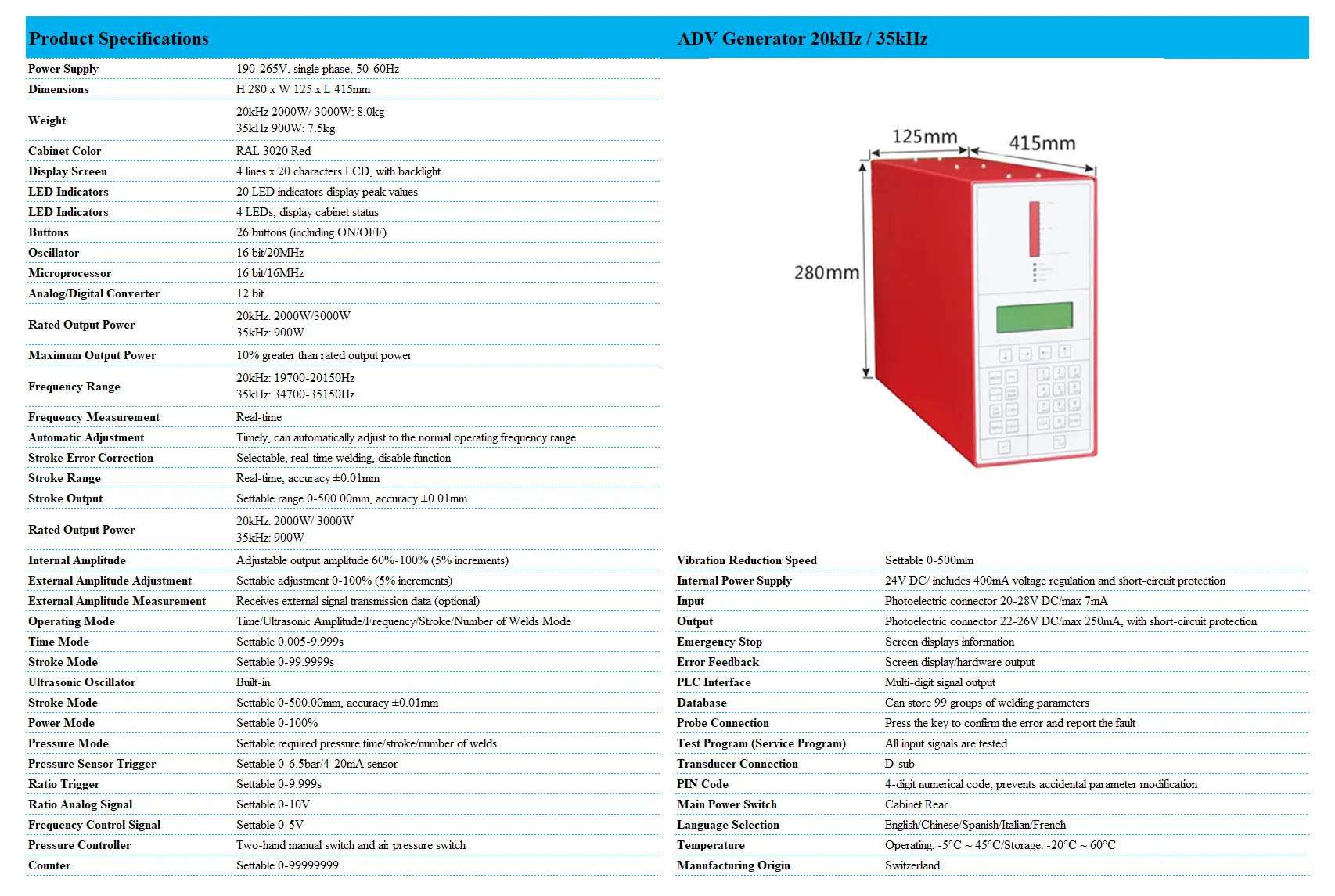 Bạn đang tìm kiếm một bộ nguồn siêu âm mạnh mẽ, ổn định, và linh hoạt để nâng cao chất lượng và tốc độ sản xuất? Với công nghệ tiên tiến từ Thụy Sĩ, dòng sản phẩm ADV Generator của Linggao – đặc biệt là các phiên bản Nguồn siêu âm Linggao ADV 35khz 900WLinggao ADV 20khz 2000W – chính là câu trả lời hoàn hảo. Đây không chỉ là một bộ nguồn, mà là một trái tim công nghệ mang lại độ chính xác tuyệt đối cho quy trình hàn siêu âm của bạn.