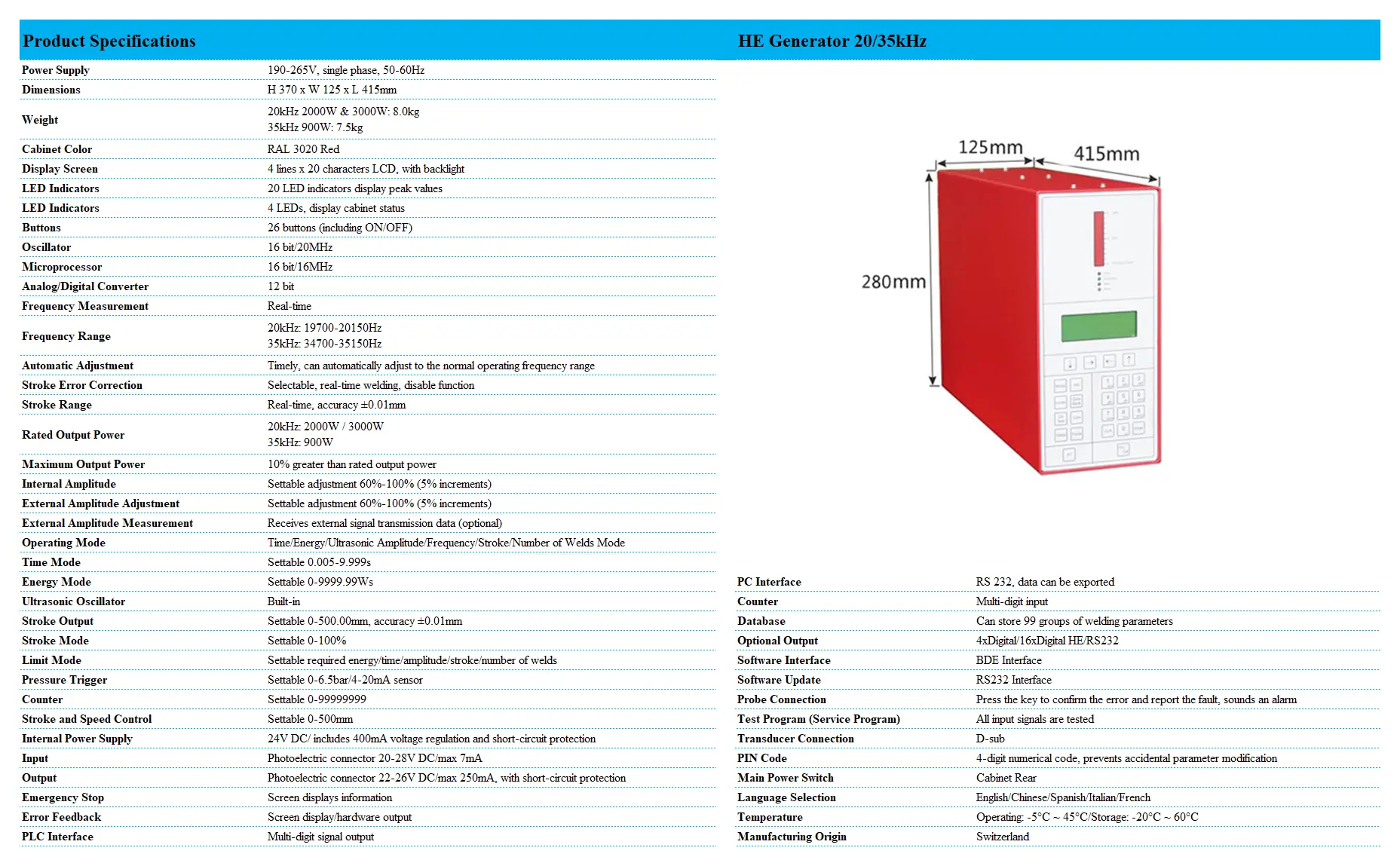 Trong ngành công nghiệp hàn siêu âm hiện đại, độ ổn định và khả năng kiểm soát chính xác là yếu tố then chốt. Dòng sản phẩm HE Generator của Linggao – đặc biệt là các phiên bản Nguồn siêu âm Linggao HE 35khz 900WLinggao HE 20khz 2000W – được thiết kế để thiết lập một tiêu chuẩn mới về hiệu suất và độ tin cậy. Được sản xuất tại Thụy Sĩ, Linggao HE không chỉ là một bộ nguồn mà là một giải pháp quản lý năng lượng siêu âm thông minh, giúp tối ưu hóa mọi quy trình sản xuất của bạn.