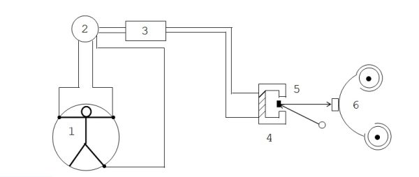 Một sơ đồ của máy điện tim đơn giản với phương pháp ghi trên phim ảnh được chỉ ra trên hình 1-9: 1- Bệnh nhân cùng các điện cực; 2- Bộ chuyển mạch đạo trình; 3- Bộ khuếch đại; 4- Điện kế; 5- Hệ thống ghi quang học; 6- Cuộn giấy bằng cơ khí.